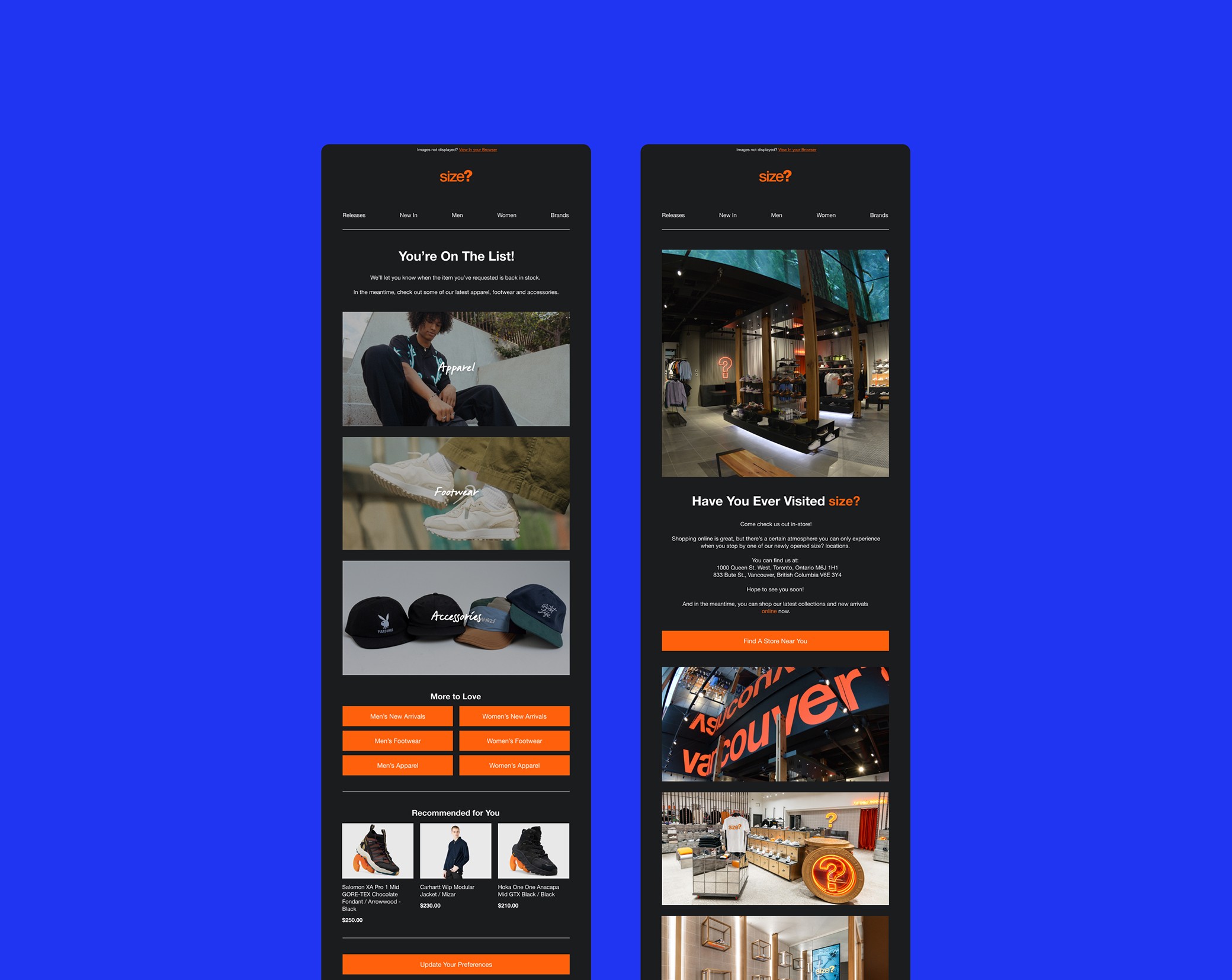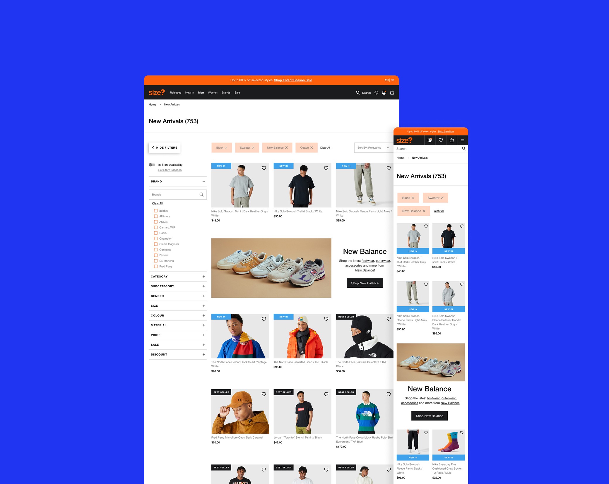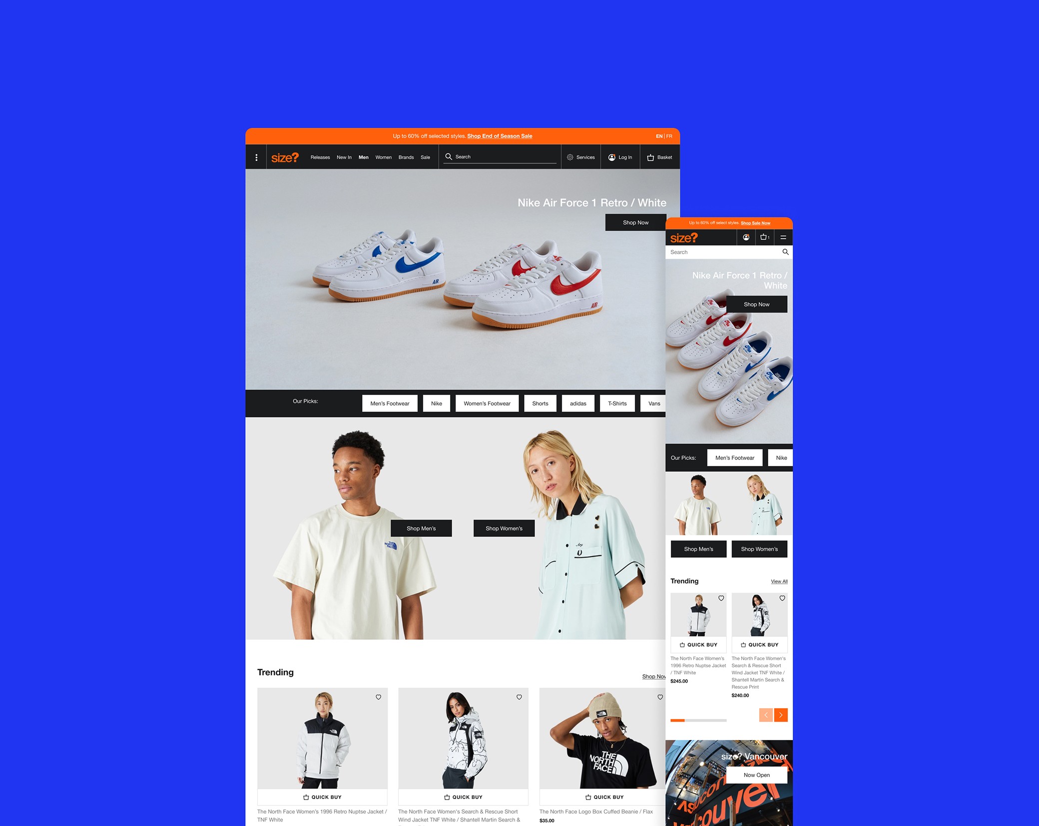 I led the design and evolution of size?’s Canadian e-commerce experience, helping build a more cohesive, scalable, and performance-driven platform for one of the world’s leading sneaker and streetwear retailers. A core part of the work was the creation of a foundational design system, establishing consistent patterns, components, and standards to support faster iteration and long-term scalability across the product. This system underpinned a comprehensive redesign of key experiences, including the homepage, product listing pages, product detail pages, basket and checkout flows, and a wishlist experience. Alongside execution, I drove A/B Testing and usability testing, using insights to inform product strategy, validate design decisions, and continuously refine the experience. The focus throughout was on improving product discovery, clarifying information hierarchy, and reducing friction across the purchase journey, particularly in high-intent moments.